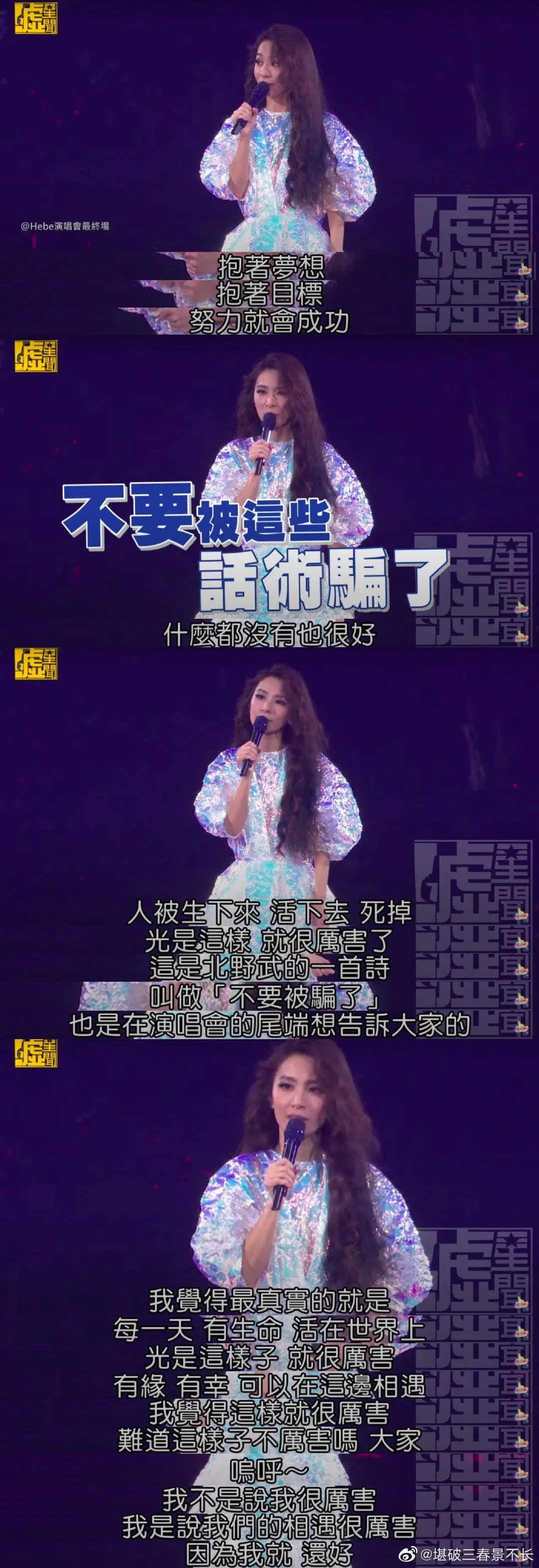 她会在唱《无常》时,跟底下的歌迷说:不知道我们会什么时候走在一起,又什么时候走散,就是把握当下,赶快唱歌。她也会在演唱会talking的时候讲自己的人生哲理,比如她会劝诫歌迷要慎言,特别是现在网络发达,大家的发言都变得非常便利,希望大家在按下发送键前可以多思考一下,网络应该是好的工具、好的发明,应该传递更多美好的事物。
