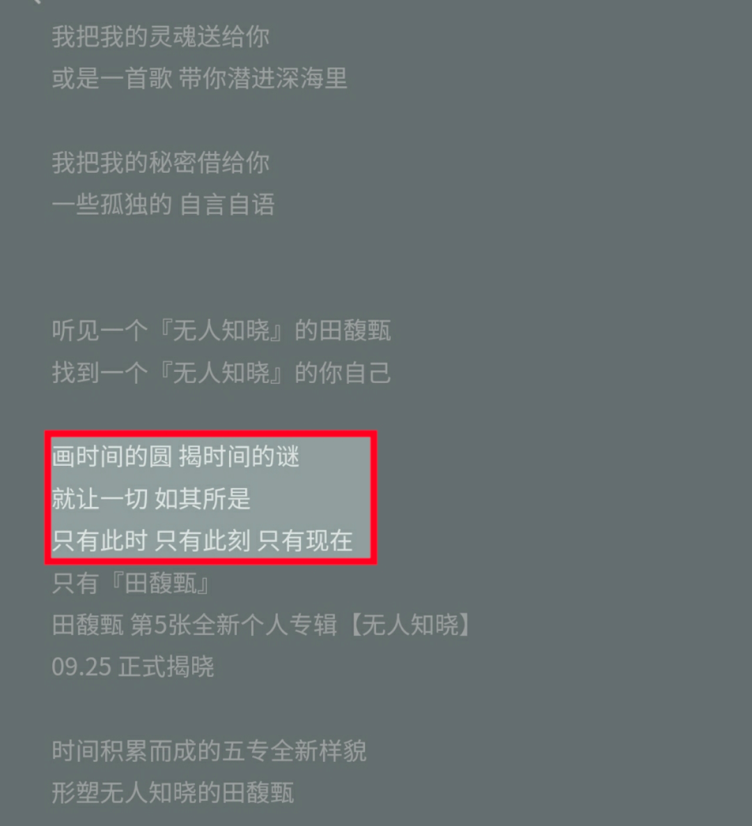 截图部分的文案都透露着白巫师【永恒、施魔法、接受】的能量,而《无人知晓》这张专辑,无论从立意还是专辑的选题,以及专辑的制作,都蕴含着田馥甄四大印记的能量,这里不展开说明了,大家有兴趣可以打开这张专辑,去听每一首歌,看每一个故事。