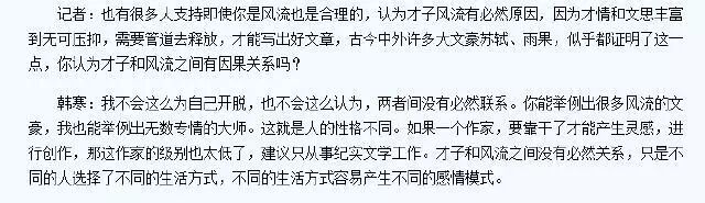 接着记者,又试图从“人性”上为韩寒开脱,说才子都风流,像苏轼,雨果等大文豪都这样。但又遭到韩寒否认:“你能举例出很多风流的文豪,我也能举出出无数专情大师。”并认为才子跟风流没有必然联系。”