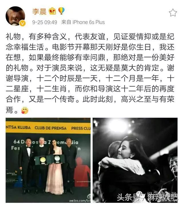 礼物,有多种含义,代表友谊,见证爱情抑或是纪念幸福生活。电影节开幕那天刚好是你生日,我还在想,如果最终能够有幸问鼎,那绝对是一份美好的礼物。对于演员来说,这无疑是莫大的肯定。谢谢导演,十二个时辰是一天,十二个月是一年,十二星座,十二生肖,而你和导演这十二年后的再度合作,又是一个传奇。此时此刻,高兴之至与有荣焉。