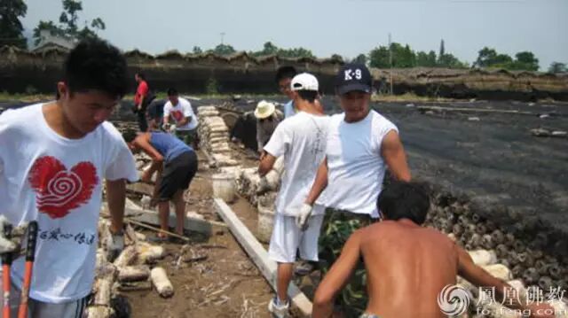 5•12地震期间,什邡种子木耳的农民损失惨重,吴京在素全法师的带动下,冒着酷暑在木耳地里修复倒伏的架子。