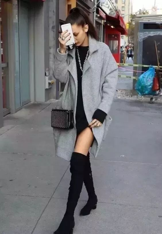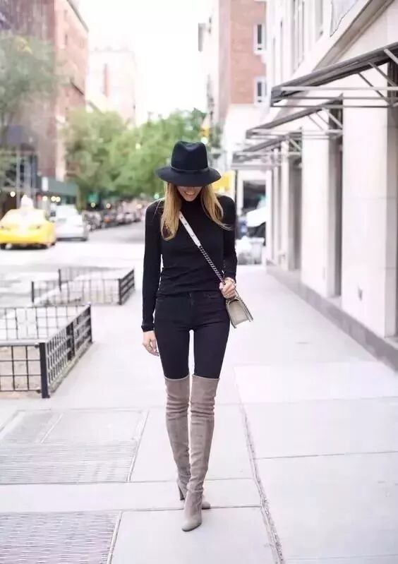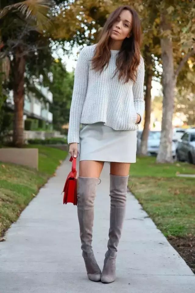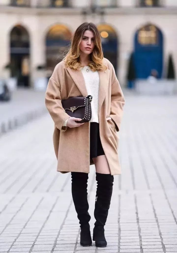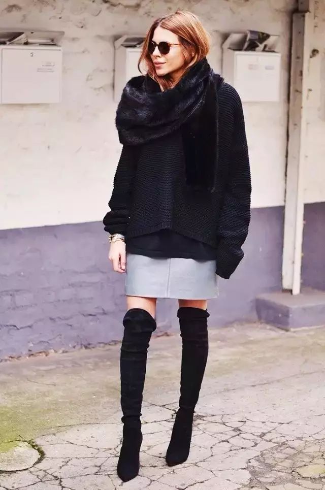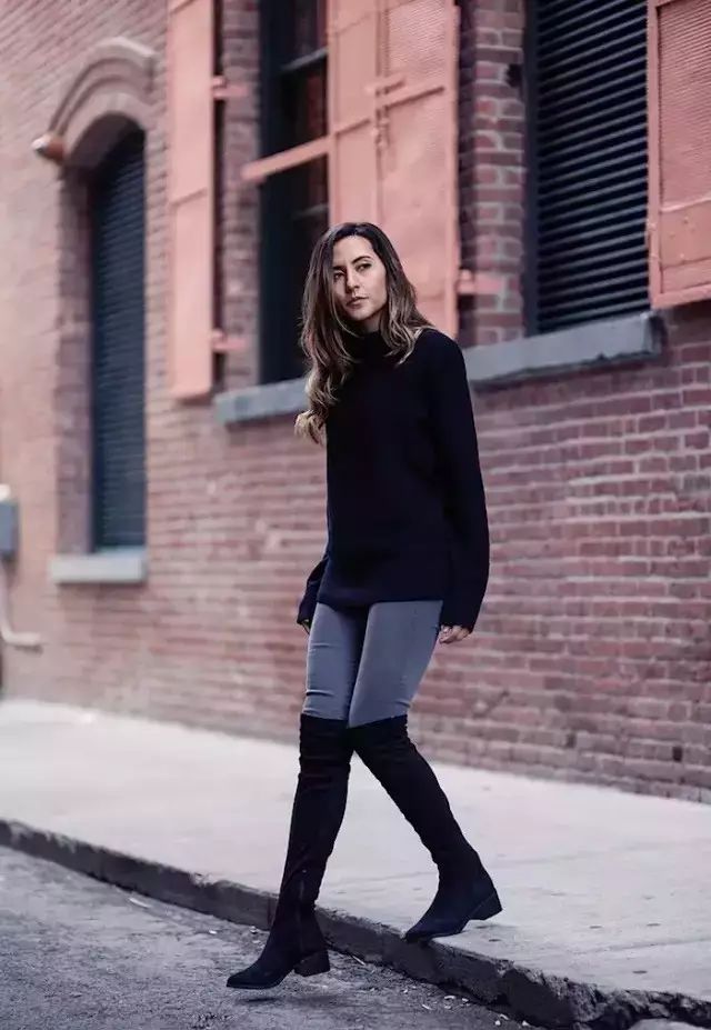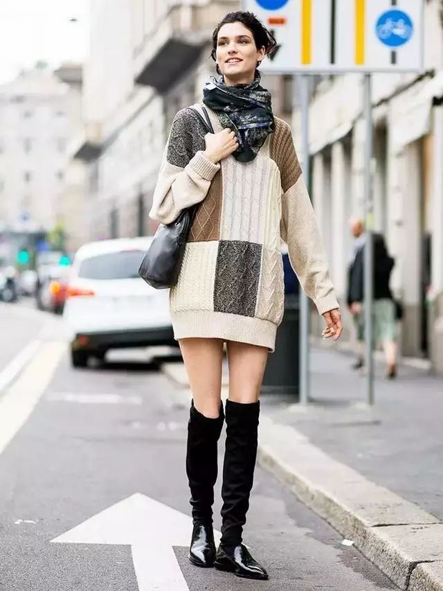 长款毛衣选择到包臀的长度,靴子以过膝的的长度刚好,比例会很好。