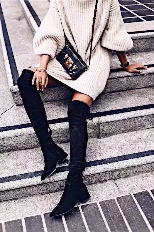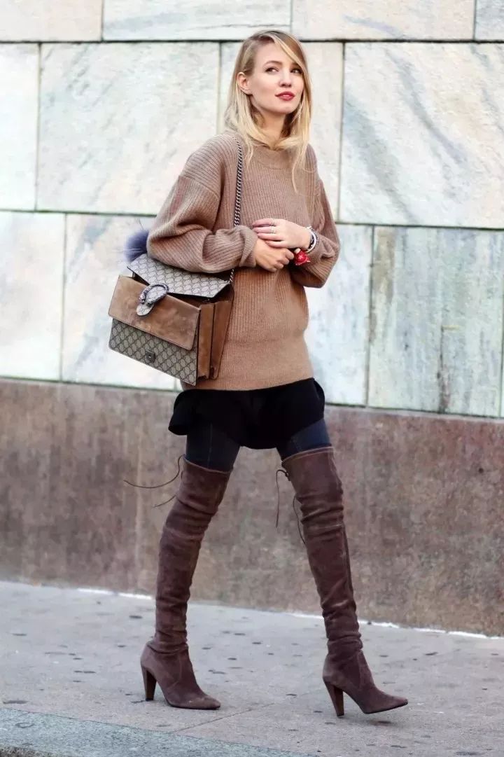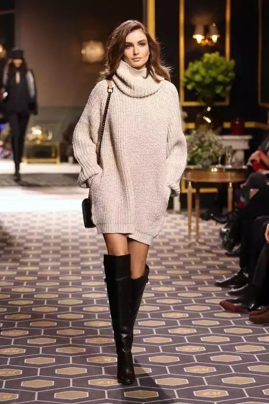 长靴不但可以打造出大长腿,在冬日里还可以帮助我们保暖,可以说是兼备了有型又实穿。而长靴和毛衣的组合,集柔美与性感于一身,简直就是完美契合。