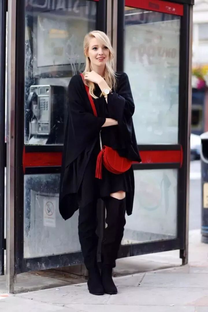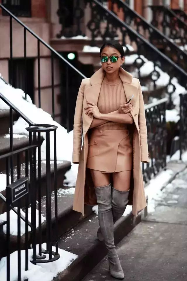 除了毛衣裙和长靴同色,如果你连外套都一体色,在适当的露肤,小女人妩媚。
