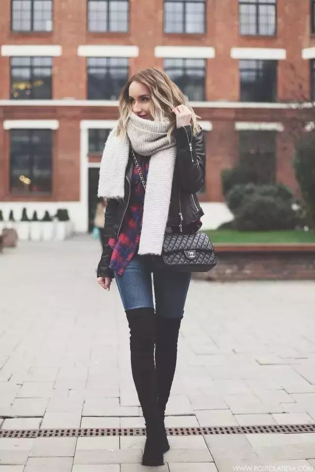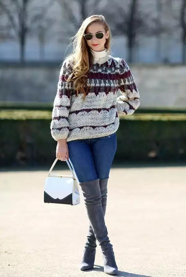 当然天气冷了,保暖也是很重要的。毛衣+牛仔裤+长靴这个组合也是很够贴心了~