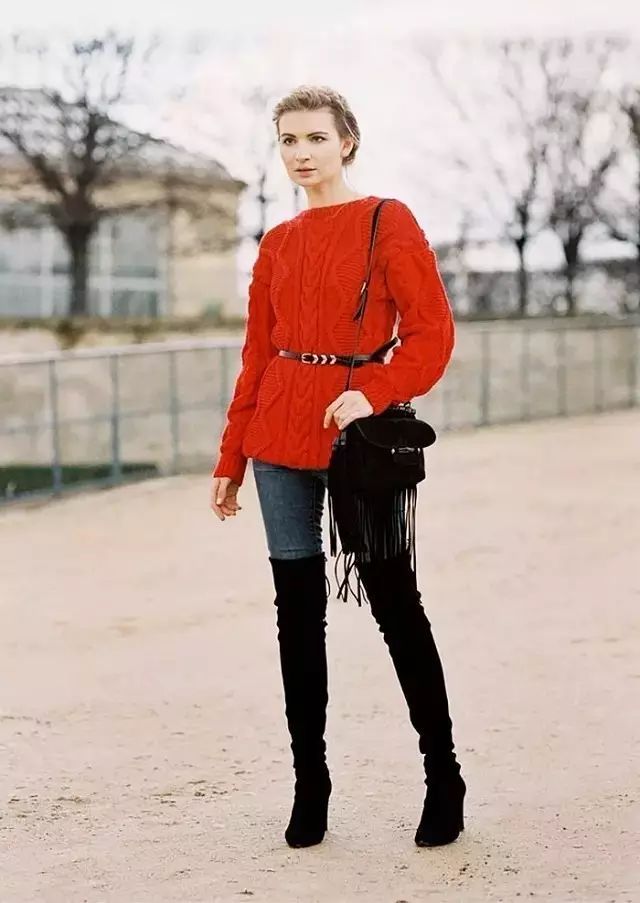 如果毛衣裙较长,可以在腰间绑一根腰带来制造腰线,毕竟显腿长还是很重要的。