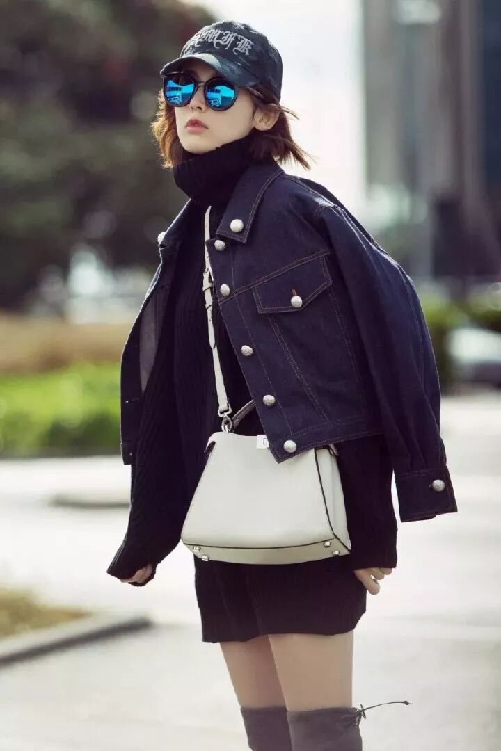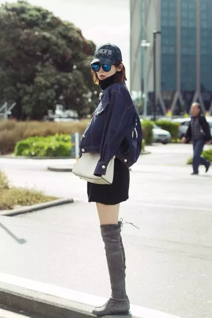 娜扎黑色高领毛衣搭配灰色高筒长靴,尽显大长腿,搭配一件牛仔外套更显时髦感。