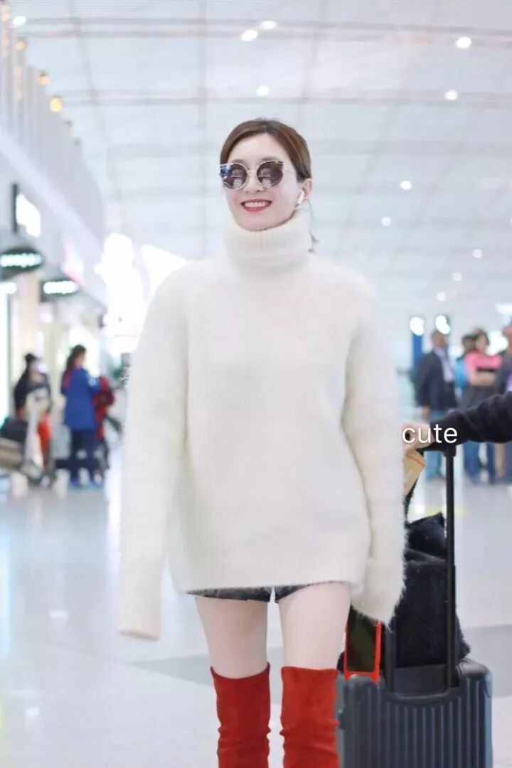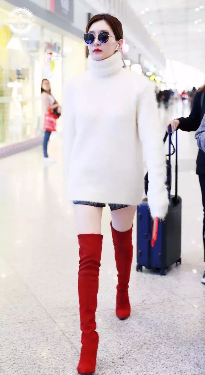 江疏影白色高领毛衣搭配明亮的红色长靴,更显肤美貌白。