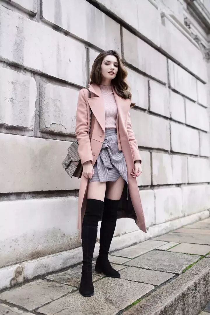 驼色和粉色外套和长靴搭配也超级好看,甜美可人。