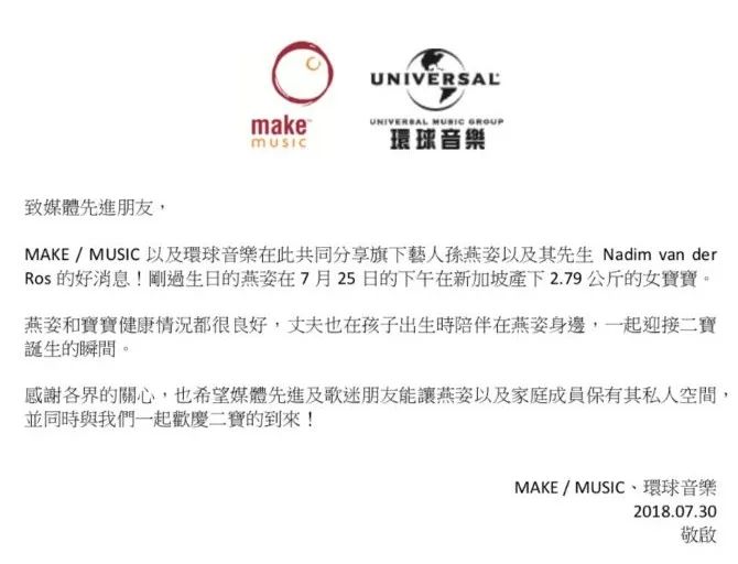 今天上午,孙燕姿突然在微博公布喜讯,称自己和老公在7月25日迎来了女儿。随后孙燕姿所属的唱片公司也发文证实了这一好消息↓