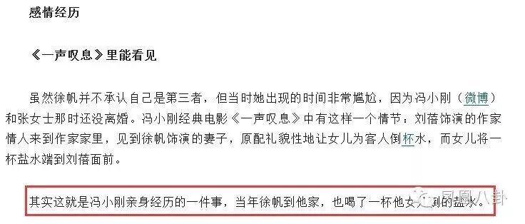 电影中,刘蓓饰演的第三者到张国立家中,张国立女儿给她倒了一杯盐水。冯小刚说,当年徐帆到他家,也喝了一杯他女儿倒的盐水。