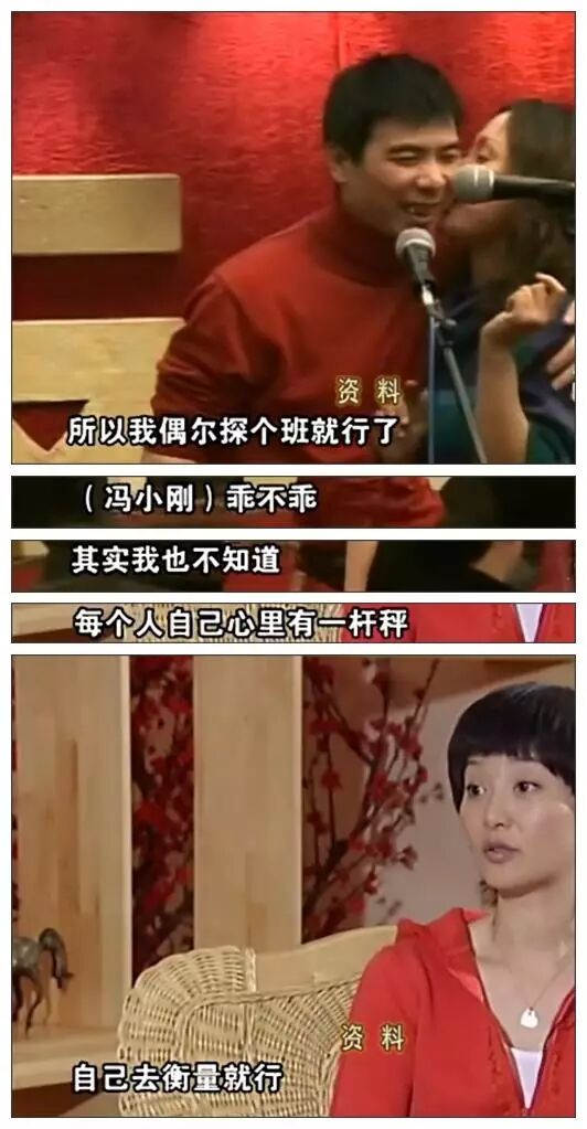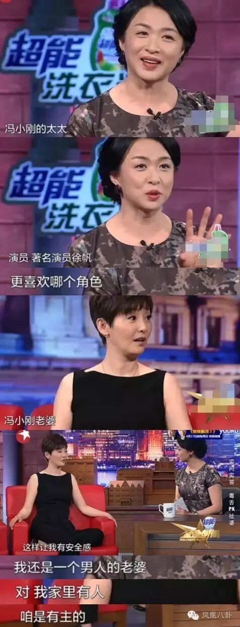 “他(冯小刚)不怎么着,人家生往上闯,你说怎么办?人家跟勇闯夺命岛似的拼命,这怎么弄啊……到了后来就觉得,反正我们家这是男的,吃亏的不是我们。有一个算一个,倒在我们家枪底下,我不吃亏。”
