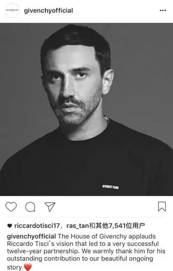 品牌通过instagram对Riccardo Tisci表达感谢: