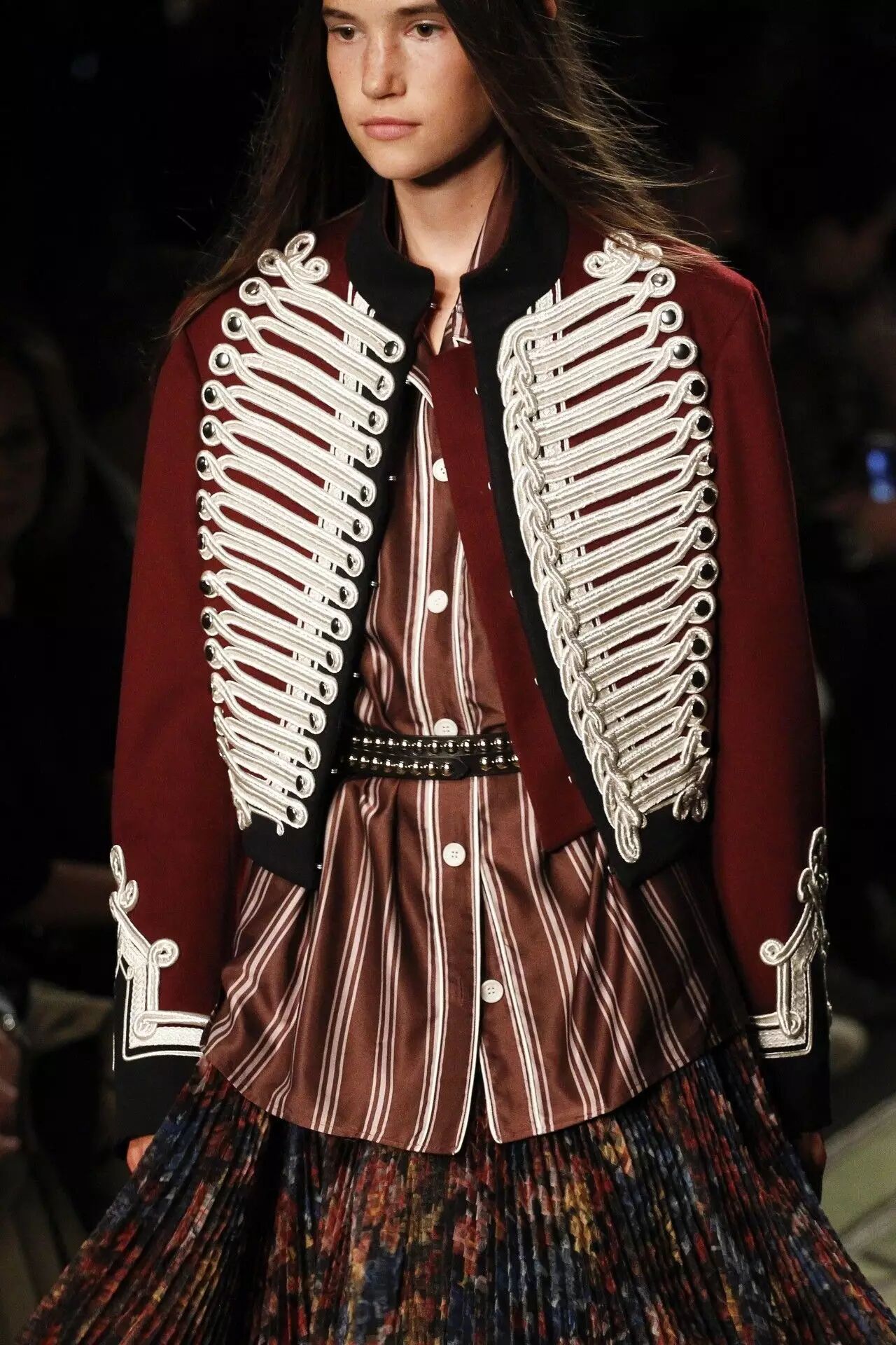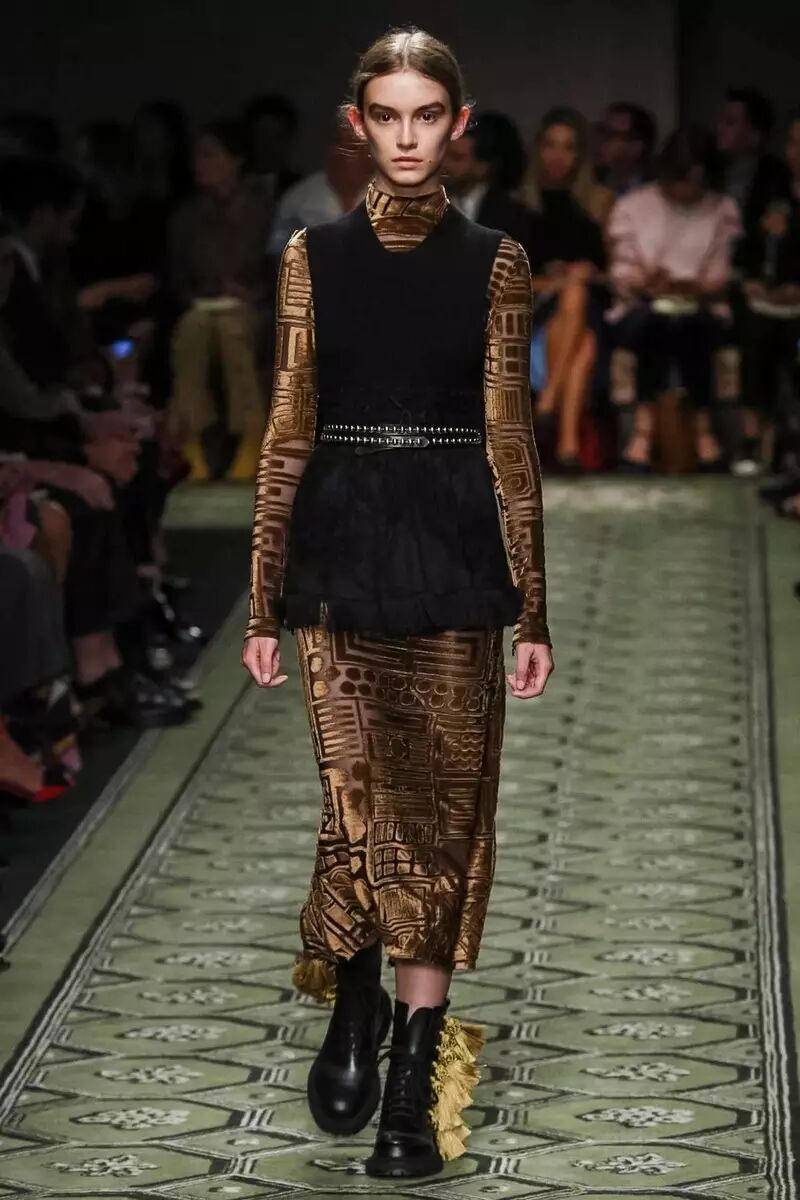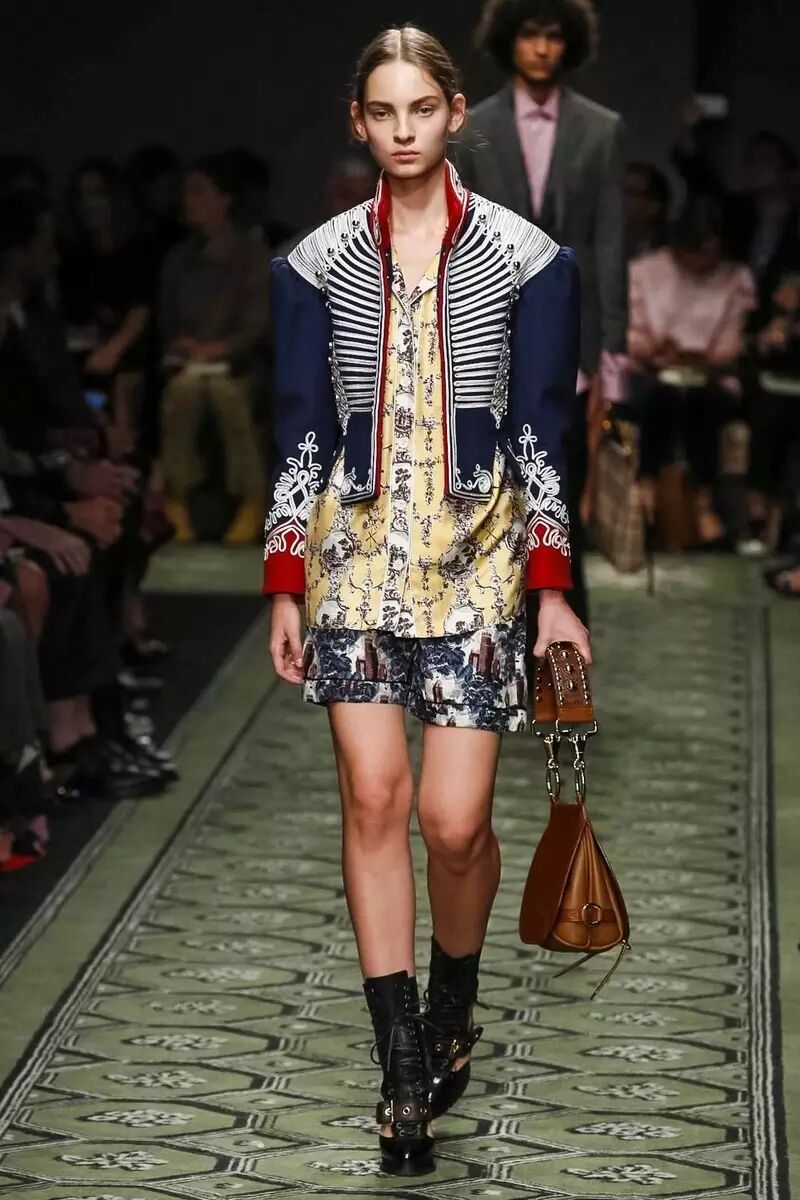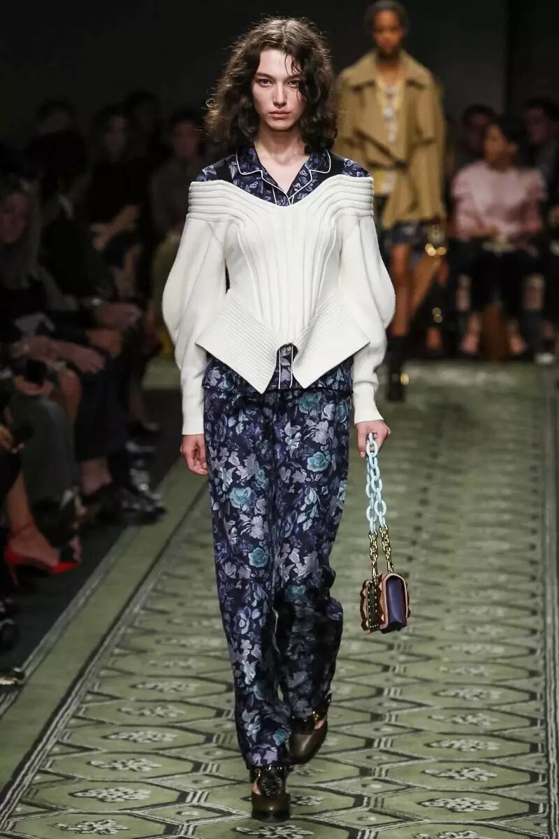绝妙的假小子风贯穿了本季Burberry的秀场,宫廷风、军装风、中性风等元素也亮相其间,尤其体现在外套上。剪羊毛大衣上布满了蟒蛇条纹,卡其色绿野夹克的五金装饰让人想起女王卫队。本季,这些略带阳刚气的时装与充满浪漫情怀的温暖大毛衣相得益彰。