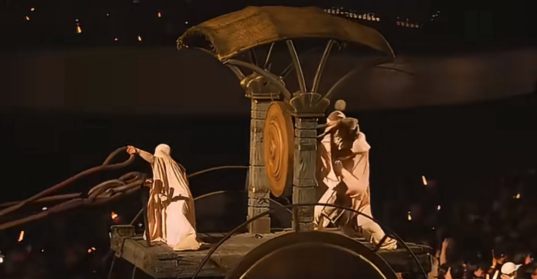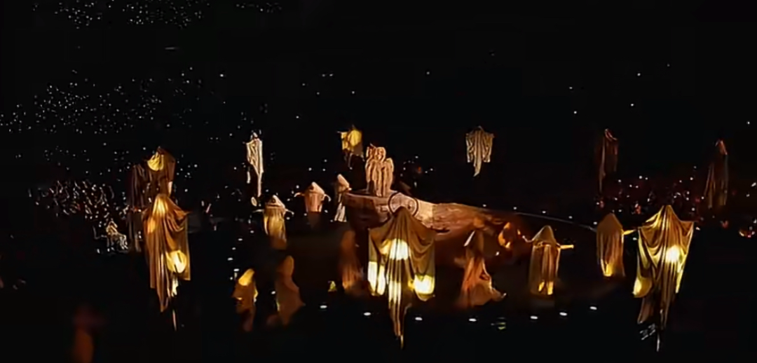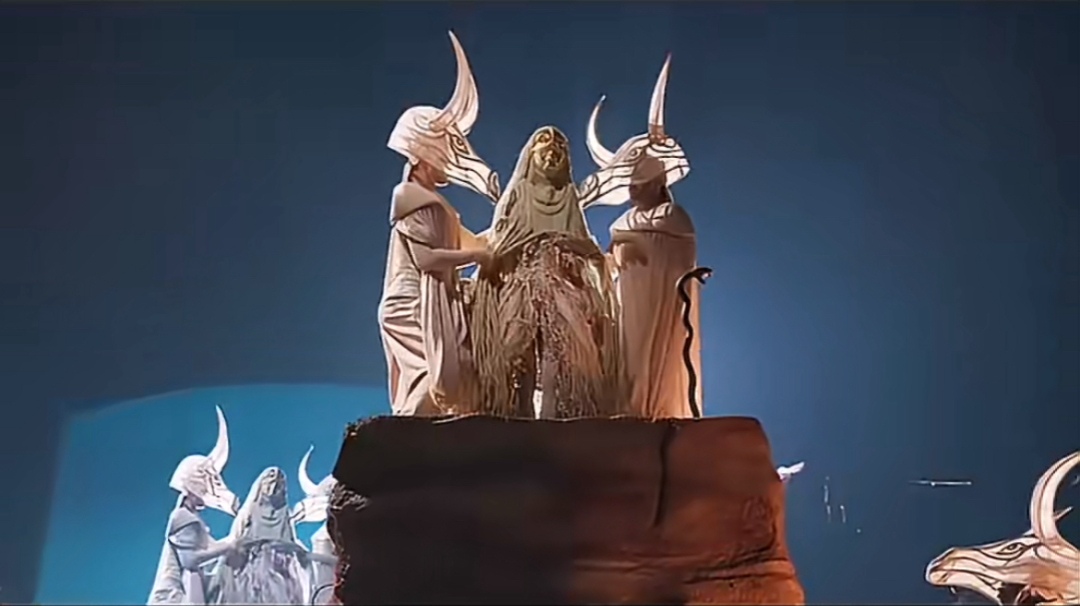 有机械巨蟒蛇、有表情木然的雕塑牛,还有悬空剑台、祭祀台等舞台设置,蔡依林本人更是扮成了女祭司的形象出场,中间有一段是一群身披白袍的人正围绕着点了火把的祭祀台手舞足蹈……