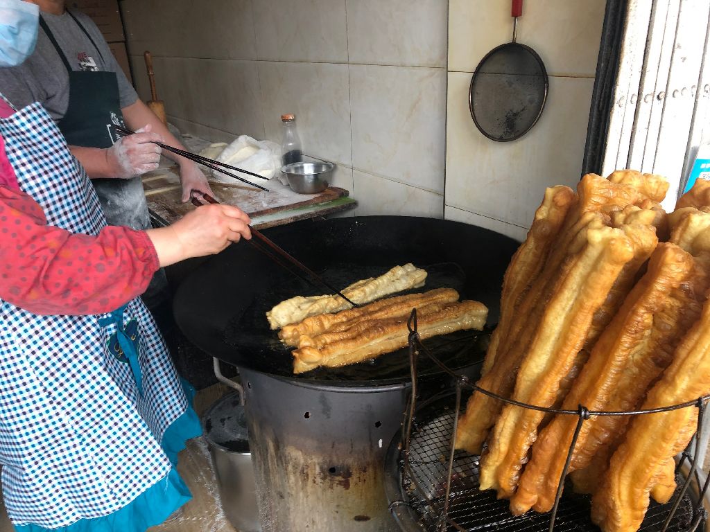 价格很便宜,我们点了一碗普通的和一碗蛋粉,另外门口的油条是现炸的,所以我们也来了一根。