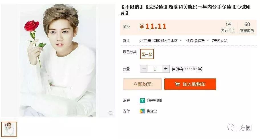 近日,明星鹿晗和关晓彤恋情一经公布,网上有商家开售“鹿晗恋爱险”,每单保费11.11元,承诺如两人一年后仍保持恋爱关系,商家便支付双倍金额,不少粉丝投保。12月16日荔枝网刊载的文章指出,媒体调查发现“鹿晗恋爱险”成交74单。