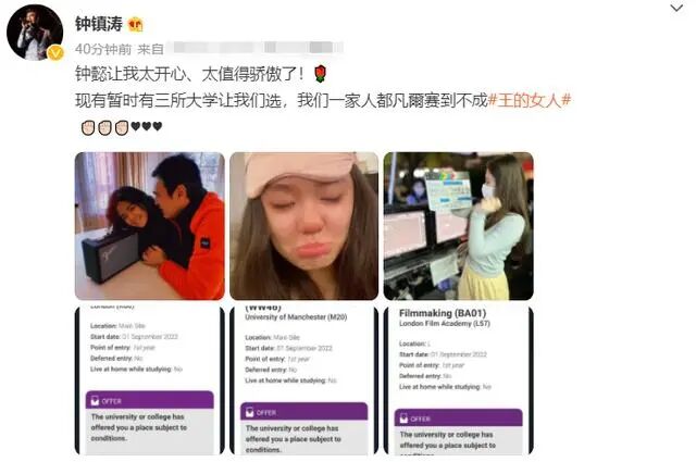 4月3日,钟镇涛在个人社交账号上分享了一组照片,兴奋地宣布女儿被三所世界著名大学录取。