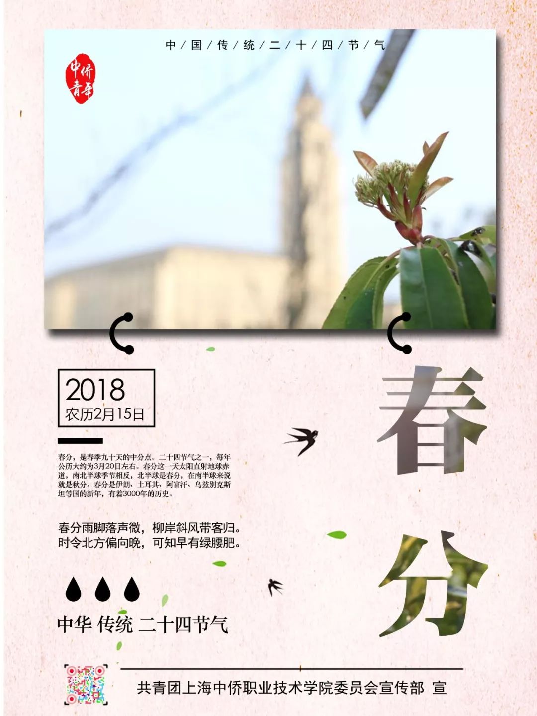 第1306期|【二十四节气·春分】万物苏醒,中侨花开 中侨青年 内地男星 2019-03-21 22:55:08 695 创作不易,用心坚持,欢迎请BaGua喝几杯爱心咖啡!打赏并支持本文 打赏并删除本文 春“春分者,阴阳相半也,故昼夜均而寒暑平。”春分,二十四节气之一,每年公历大约为3月20日左右,是春季九十天的中分点。《春游曲》【唐】 (王涯)万树江边杏, 新开一夜风。满园深浅色, 照在绿波中。而中侨的这些花儿也都笑了你可慢慢观矣人都爱四月天唯独我不懂四月的雨期却能懂三月的柳絮春色三分一分天地两分你我三分幸福鼎立 创作不易,用心坚持,欢迎请BaGua喝几杯爱心咖啡!打赏并支持本文 打赏并删除本文 感谢您的支持鼓励,我会继续努力的!文章地址:用户邮箱:打赏金额:USDT 请输入数字点击”去打赏“,即可进行打赏支持本文章哦 苏醒 About the Author 中侨青年 功能介绍:上海中侨职业技术学院团委官方微信 Related Posts 第1306期|【二十四节气·春分】万物苏醒,中侨花开 2019-03-21 22:55:08 发表评论