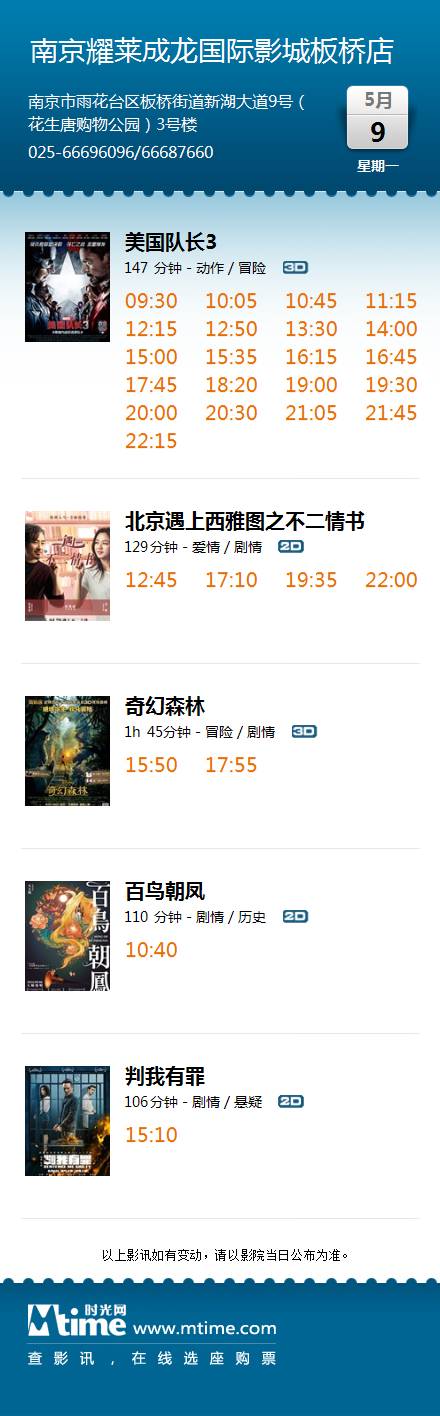 南京耀莱成龙国际影城板桥店5月9日星期一影讯
