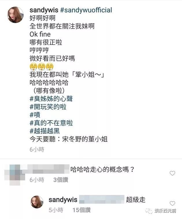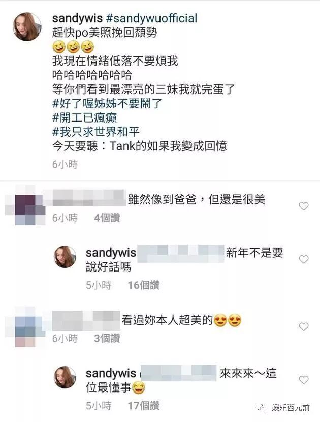搜狐娱乐讯 据台湾媒体报道,吴宗宪育有3女1子,日前突然PO出从未曝光的二女儿Vivian的照片,还揭露对方目前在自家公司当总经理,引起网友热烈讨论。他的大女儿Sandy(吴姗儒)见状,11日PO出自己美照抱怨:“好啊好啊,全世界都在关注我妹啊。”还吐槽亲妹妹“哪有很正啦”,吃醋行为让粉丝发笑。