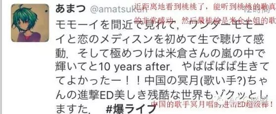 酷炫的舞台、火爆的现场、热烈的气氛,更有嘉宾们精彩的演出,可爱萌系的大岛はるな、元气十足的桃井晴子、美丽优雅的米仓千寻、温柔帅气的优十和搞笑幽默的可爱主持人佐佐木先生。日本粉丝们对本次“爆LIVE”给出了极高的评价,作为中方嘉宾出席的冥月在本次演出中也倍受关注,她那美丽悠扬的声音获得了众多日本观众们的喜爱!