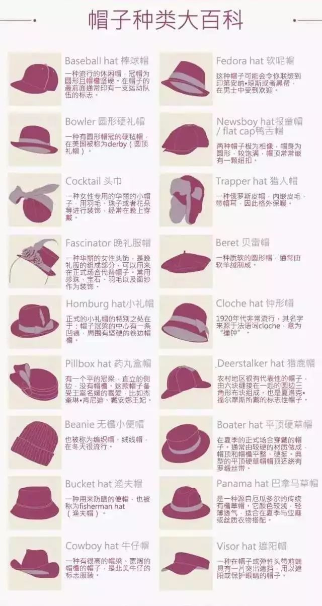 像上图所示的帽子种类就有18种之多!可是平时夏天戴得比较多的就只有几种,最重要的还是要选择适合自己脸型的~