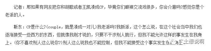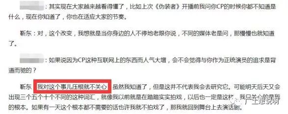 其实看了粉丝的“掐架”,说来说去还是不想自己的爱豆跟别的艺人炒CP。靳东本人也曾多次说起过“男男CP”的问题,刚开始时“老干部”压根就不懂“CP”这个词的含义,明白意思后坚决表示不接受。