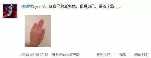 本以为这对儿到此就尘埃落定,天王也该收心娶了大家叫了7年天王嫂的熊黛林,结果13年4月,熊黛林晒出尾戒,暗示分手。疑似第三者插足致使两人分手。