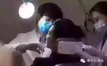 照片中,黄奕半躺在椅子上,闭着眼睛,医生手上细长的针筒清晰可见,正在往黄奕右边脸上注射,身边还围着几个护士,看上去现场气氛十分的放松。
