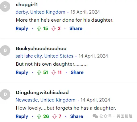 在这条新闻的评论中,很多人都提到,他对亲生女儿都没有这么好、遗忘了自己的女儿等等。