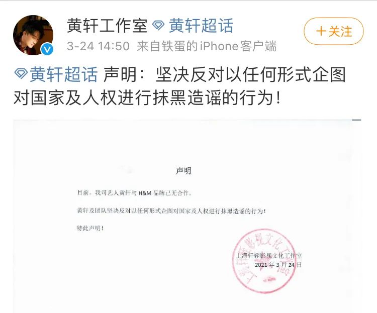 3月24日下午14时许,黄轩工作室发表声明称“目前,我司艺人黄轩与H&M品牌已无合作”。