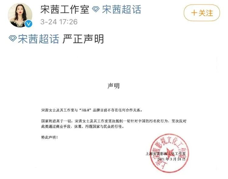 今天(24日)下午17时许,@宋茜工作室 发表“严正声明”称,宋茜女士及其工作室与“H&M”品牌目前不存在任何合作关系。