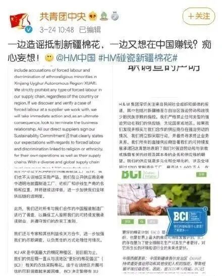 今天,@共青团中央 微博发布的两条有关H&M公司#碰瓷新疆棉花#的消息引发网友广泛关注。