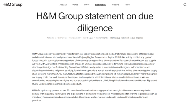据中国青年报,H&M这份声明写道:H&M集团对来自民间社会组织的报告和媒体的报道深表关注,其中包括对新疆维吾尔自治区少数民族强迫劳动和宗教歧视的指控。(H&M Group is deeply concerned by reports from civil society organisations and media that include accusations of forced labour and discrimination of ethnoreligious minorities in Xinjiang Uyghur Autonomous Region (XUAR).)