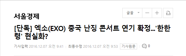 以下内容转翻自韩国媒体서울경제今日刊登的《[단독] 엑소(EXO) 중국 난징 콘서트 연기 확정...'한한령' 현실화?》(点击阅读原文查看原文)。内容不代表韩国me2day立场。韩国媒体原文标题为:《【独家】EXO中国南京演唱会延期确定...限韩令成真?》
