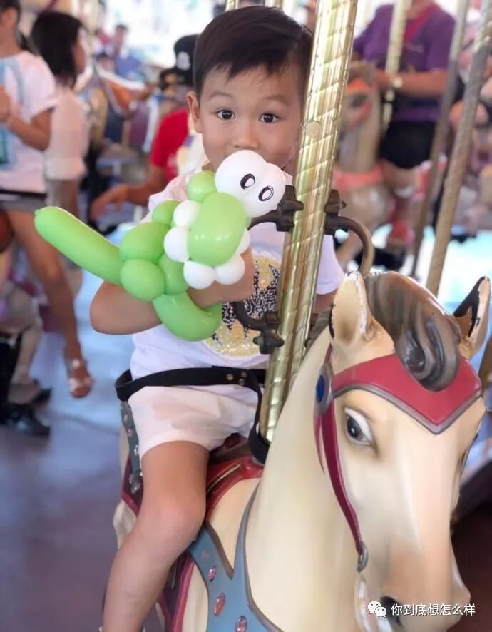 蒋丽莎的儿子小螺丝比姐姐稍微活泼些,坐在旋转木马上拿着气球玩具,一双乌黑大眼直看着镜头,呆萌十足,标致的五官更像爸爸多一些,像看到了mini版的小陈浩民,将来长大了穿上古装估计也是个玉树临风的第二代段誉啦!