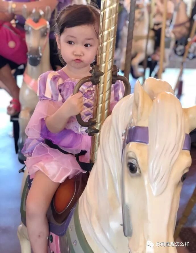 贝拉也同样坐在旋转木马上,身穿粉紫色的蓬蓬裙,看起来就像是一个出现游玩的小公主,粉扑扑的小脸蛋,细细的柳叶眉,精致又可爱,尤其是那撅着小嘴的模样,俏皮十足,贝拉果然是四个孩子当中在镜头前最搞怪的萌娃。