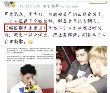 非著名娱评人吴清功指出:其实早在12月22日,就有网友爆料吴亦凡和黄子韬和好了,中间人可能是鹿晗。他们三个人建了个微信群,每天在群里聊得热火朝天,据说群主是鹿晗。