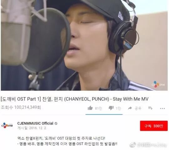 截止至12日(当地时间),EXO 朴灿烈XPunch为tvN电视剧《鬼怪》演唱的OST《Stay With Me》MV在YouTube上的点击量突破了1亿。该曲于16年12月3日公开,发布当时就占据了各个音源网站上位圈,展现了火爆的人气。同时,这也是韩国电视剧OST MV中首次突破1亿点击量的MV,意义非凡。厉害啦~~~