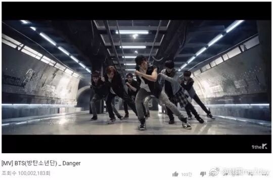 防弹少年团《Danger》MV点击量突破1亿,共9支MV超过1亿点击量!