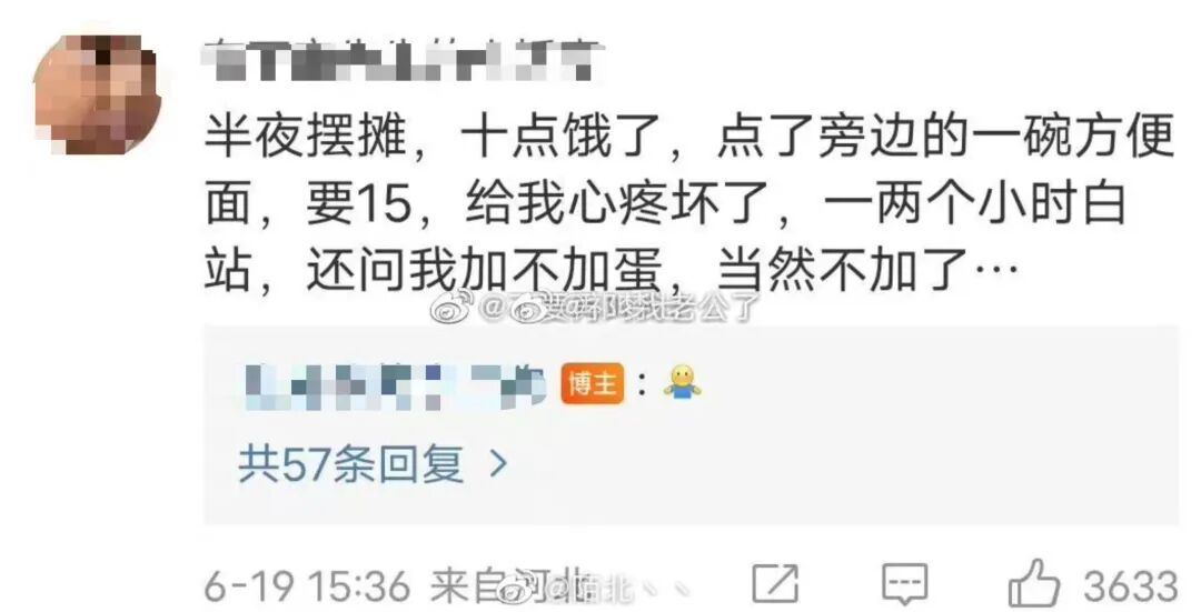 半夜摆摊饿了,点了旁边一碗方便面,要15,心疼坏了,还问要不要加蛋。当然不加了。