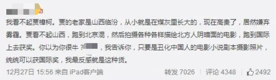 这还没完。在拍摄了许多反应现实的作品后,贾樟柯被某些人说成: “靠丑化中国,拿国际奖。”