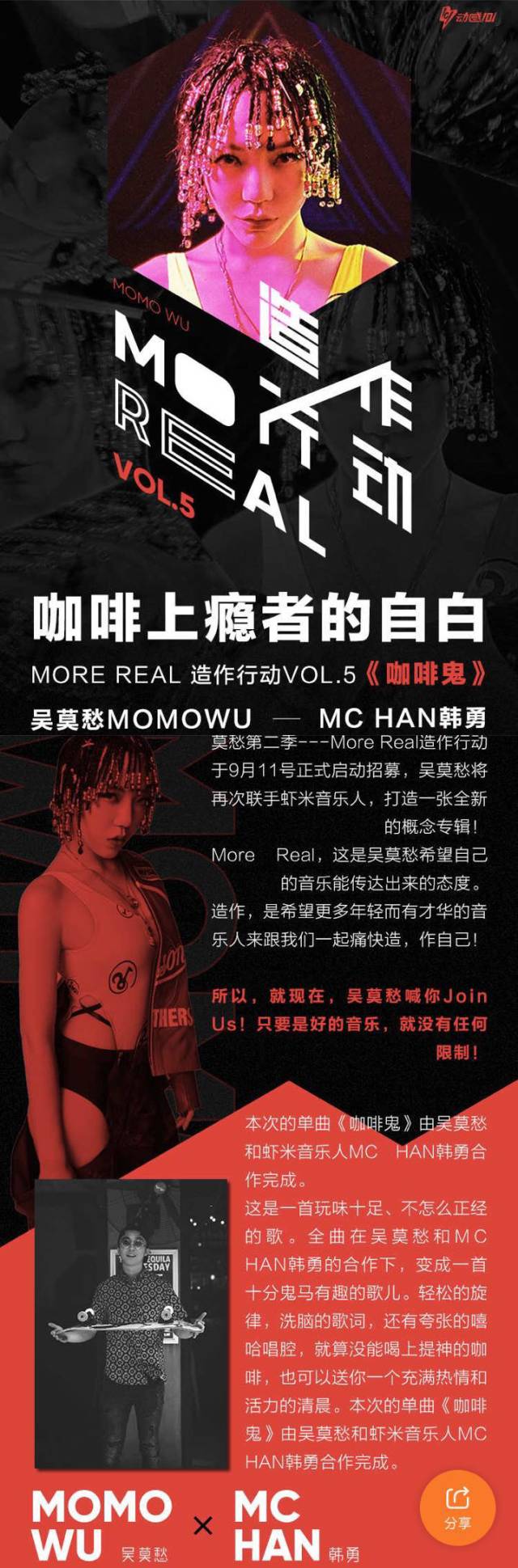 给吴莫愁在MV里面设计这么一个”见鬼愁,就出手“的设定,其实也是间接的传递了她在这一次More Real造作计划里的”代言人“的身份,通过她的帮助,发现好音乐,让更多的“音乐鬼”的好作品,被更多人听见!