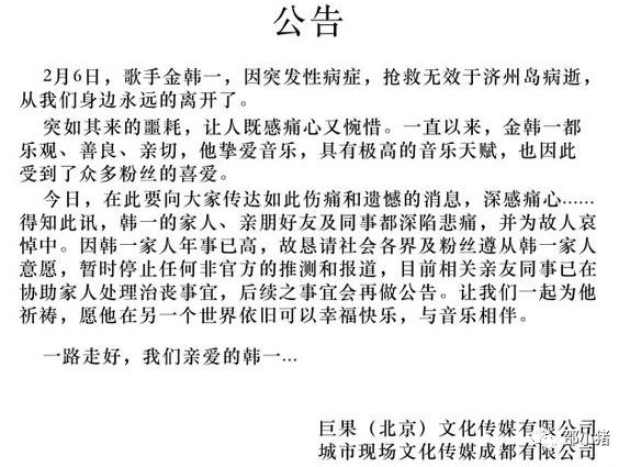 金韩一目前死因不明,所属公司“巨果娱乐”仅透过微博发文,并证实死讯“因突发性疾病,在济州岛病逝”。此外,也有网友扒出,他曾经在朋友圈中,PO出一张有菜、有肉的食物照片,透露因工作节食减肥,罹患了厌食症,导致严重缺铁和贫血,被医生规定餐餐要吃肉,直说:“现在每餐都是肉,真的无法自拔了,先以健康为主吧!”虽然消息并未被证实,但他突然猝死,使得传言甚嚣尘上。