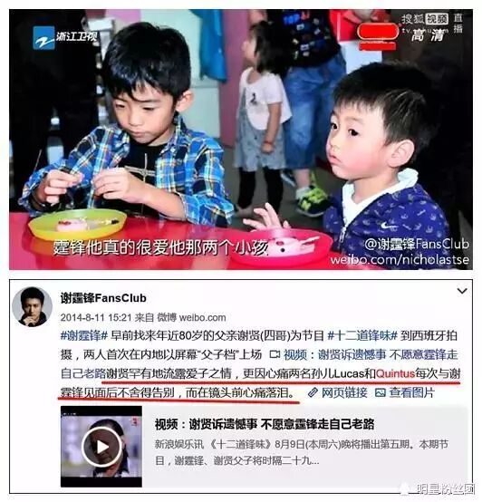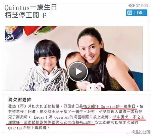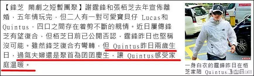 杂志报道说,现在Quintus有自己的想法,不太乐意见谢霆锋,就连奶奶“拉姑”(狄波拉)的家庭聚会,都哭闹说不去,连张柏芝也没他办法,所以近半年的谢家聚会,都只有大哥Lucas出席。