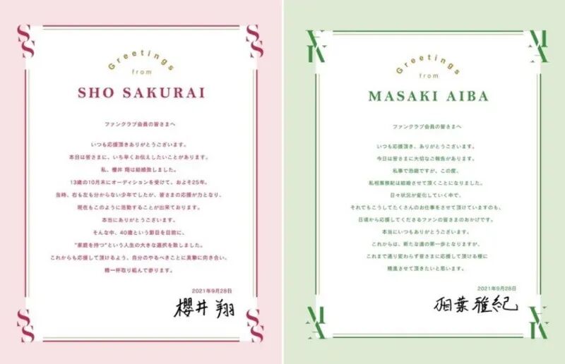 9月28日下午,成员樱井翔和相叶雅纪透过Johnny's粉丝俱乐部率先公布结婚的消息