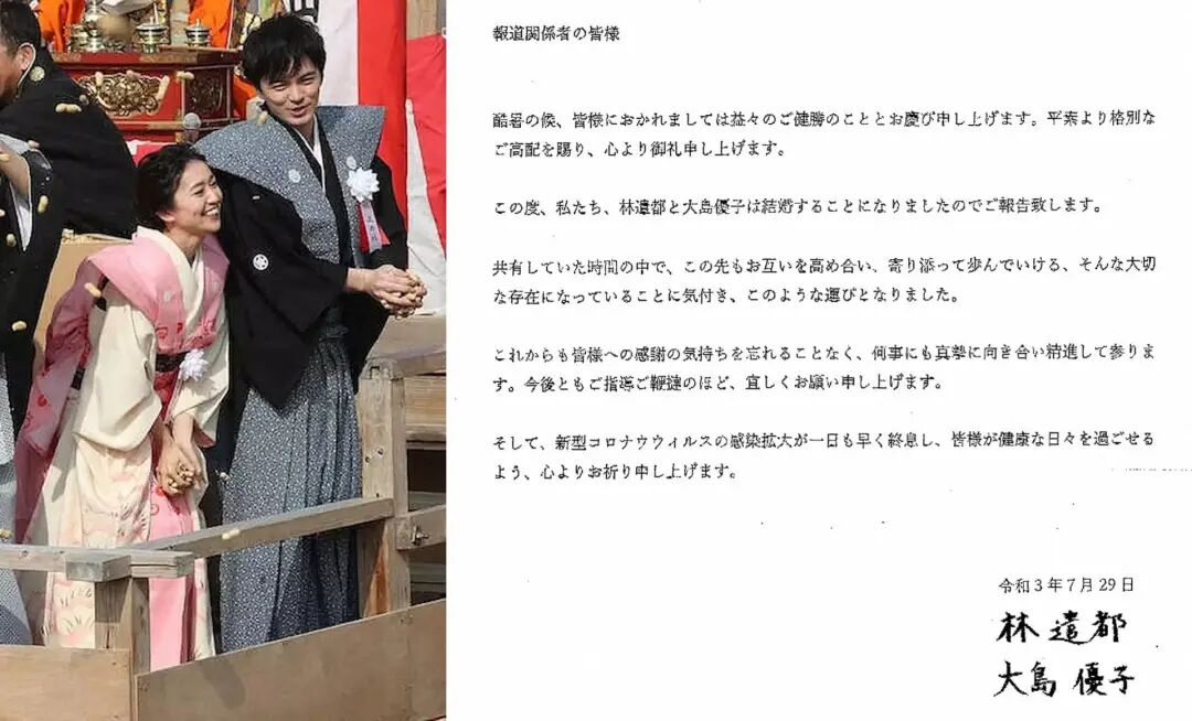 大岛优子,7月29日宣传和演员林遣都结婚.由于两人的恋情过于保密,不少粉丝都表示「被吓醒」
