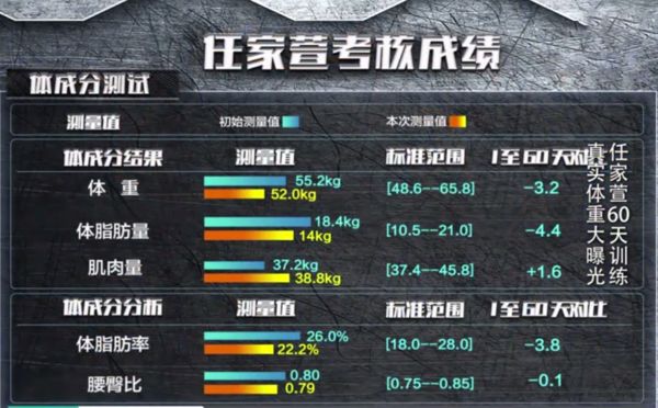 在参加节目前Selina体重是55.2KG,身高164的她这个体重并不算胖,但也是属于微微有肉的类型。经过60天的训练后Selina的体重下降到了52KG,虽然体重变化得不是特别大,但体型变化真的超级明显哦。