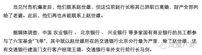 这个赵世雄呢,倒是没跑路,但人家放话说了——交通银行从来都没有跟六宝基金有过官方合作,至于我自己,已经辞职又离婚了,当初离婚的时候财产都判给了老婆,所以你们找我也没用!